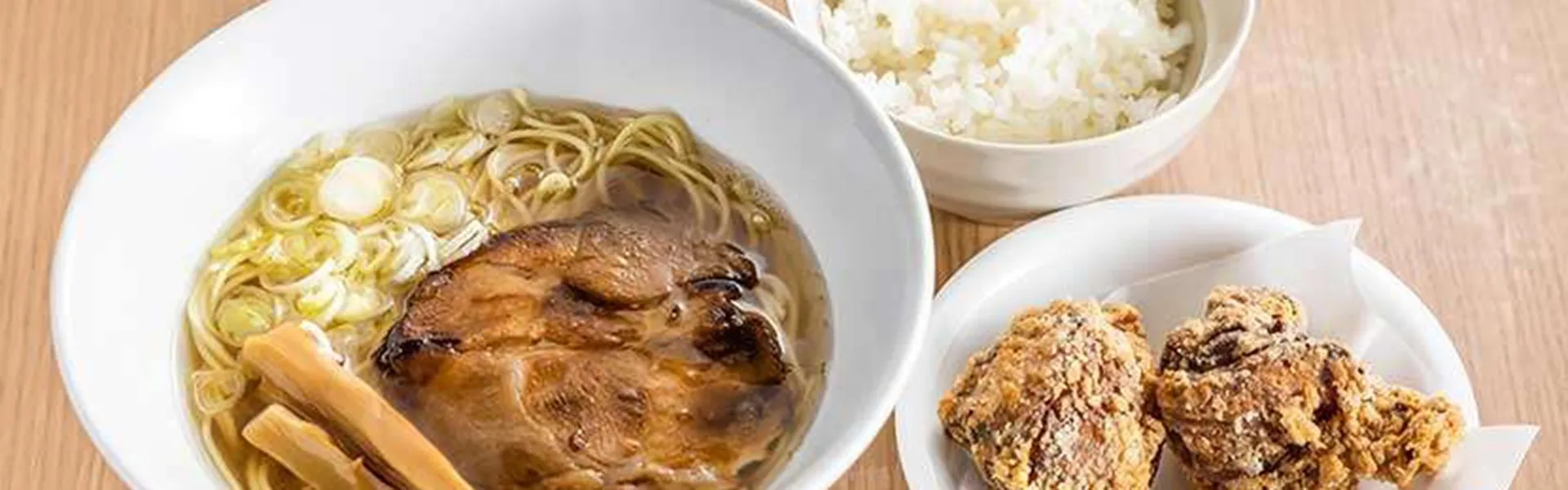 一般には「北九州と言えば豚骨」というイメージがあるかもしれませんが、あえて地元では味わえないラーメンを提供したいと願い、煮干しをメインに魚介系の原料だけを使用しています。煮干しならではの風味と味わい、美しい黄金色のスープと芳醇な香りをぜひお楽しみください。お得なセットメニューも用意しております。